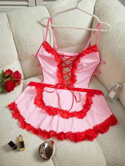 2pcs/Set Plus Size Lace Patchwork Hollow Minimalist Jumpsuit & Apron - Pink - View 1