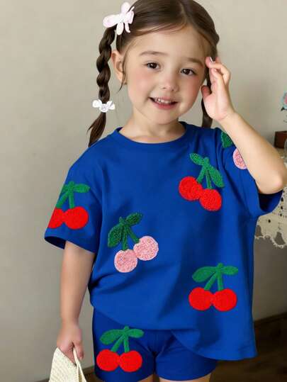 1 Set Baby Girls Casual Comfortable Fashion Sweet Cute Faux Towel Embroidered Cherry Pattern Short Sleeve T-Shirt And Shorts Set, Spring To Summer Outfits, Suitable For Outing, Refreshing Navy Blue Summer Outfit