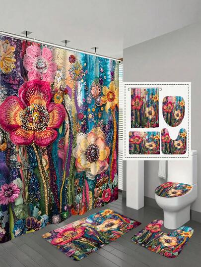 1/4pcs Vintage Floral Printed Bathroom Curtain Set, 100% Polyester Fabric, Washable Shower Curtain, Bathroom Decor Set Includes Waterproof Curtain, Non-Slip Mat, Toilet Lid Cover, Bath Mat And 12 Plastic Hooks, Bathroom Wet And Dry Separation Curtain, Household Essential, Suitable For All Seasons