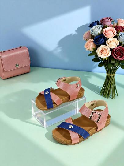 1 Pair Children's Glitter Criss-Cross Strap Faux Leather Non-Slip Open Toe Low-Top Buckle Ankle Strap Flat Casual Fashion Sandals, Suitable For Summer Daily Wear And Beach Vacation - Multicolor - View 1