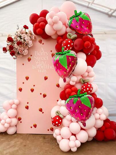 128pcs/Set-Strawberry Balloon Arched Arch Set, Red & Pink & Green Balloons With Strawberry Balloon Garland Arch Set, Consisting Of 128 Pink And Red Balloons With Large Strawberry Aluminum Foil Balloons, Red Polka Dot Balloons, And Green Balloons, Suitable For Sweet Girl Berry First Theme, Boy Girl BabyShower, Gender Reveal, Wedding, Birthday, Room Party Decorations
