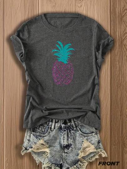6. 1PC, Women'S Pink T-Shirt With Pineapple Graphic - Soft Blend, Short Sleeve, Round Neck, Casual Summer Top, Perfect For Beach Or Vacation Outfits, Casual Summer Top | Pineapple Graphic Tee | Blend FabricS-XXL