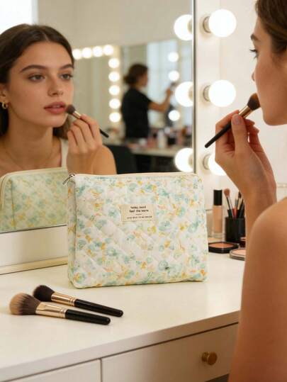 1pc Large Capacity Floral Fabric Cosmetic Bag, Red & Green, Zipper Closure, Handheld Makeup Pouch, Multi-Functional For Students, Dorms, Graduation, Thanksgiving, Mother's Day, Valentine's Day, Travel, Suitable For Women