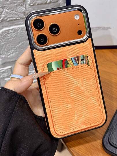1pc New Fashion Minimalist Orange Card Holder Denim Texture Phone Case Compatible With IPhone 17 Pro Max/17 Pro/17/16 Pro Max/16 Pro/16/15 Pro Max/15 Pro/15/14 Pro Max/14 Pro/14/13 Pro Max/13 Pro, Unisex Stylish And Durable Phone Protective Cover