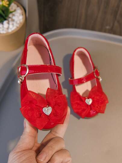 2-7 Years Old Red Shiny Leather Baby Girl Shoes, Soft & Comfortable With Easy Strap, Simple & Fashionable Toddler Flat Shoes For Spring/Autumn, Non-Slip & Durable Soft Sole Lightweight Baby Girl Leather Shoes, Summer Red Shiny Leather Bow Heart Rhinestone Cute Baby Girl Shoes, Elegant Red Shoes Suitable For Dresses, Performances, Daily Life, Shopping, Sightseeing, Parties, And Social Occasions - Red - View 5
