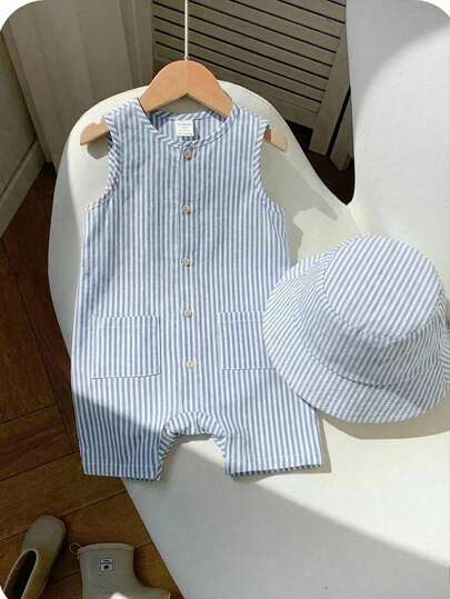 2-Piece Set With Free Hat: Baby Boy Baby Girl Summer Apricot Striped Crew Neck Sleeveless Jumpsuit And Vacation Casual Bucket Hat, Perfect For Travel - Blue - View 1