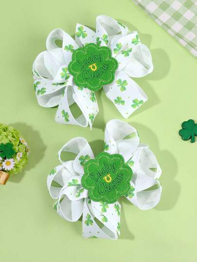 2pcs St. Patrick's Day Clover Embroidered Hair Bows For Girls Lucky Clover Bow Alligator Clips Adorable Shamrock Korker Hair Clips Parade Barrettes Cute Sweet Clover Hairpins Teens Hair Accessories - Multicolor - View 1