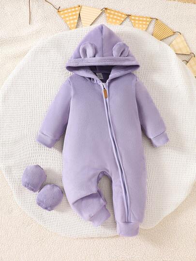 6. 3pcs Set Baby Boys Double-Sided Berber Fleece Hooded Bear Ear With Leather Zipper & 2 Gloves, Minimalist Versatile Casual Unisex Jumpsuit