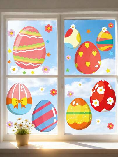 3pcs Easter Eggs Static Cling Glass Stickers - Cute Cartoon Egg Flower Pattern Decals (Reusable); Easter Party Decorations Stickers, Easter Souvenirs Stickers, Easter Window Decor Stickers, Easter DIY Decorative Glass Stickers, Easter Atmosphere Creation Supplies, Easter Photo Prop Decorations, Easter Window/Glass Door Atmosphere Decor Stickers, Suitable For Spring Home/Party Window Decor, Holiday Guest Souvenirs - Multicolor - View 3