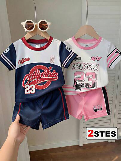 4pcs/Set Baby Girls' "California/New York" 23 Graphic Round Neck Short Sleeve T-Shirt And Elastic Waist Shorts Set, Baby Girls' Sports Outfit, Sporty Street Style, Multi-Piece Set, Two Short Sleeve Sports Sets, Sports Elements, Numeric Elements, Lettering Elements, Suitable For Summer, Fits 6M-3T