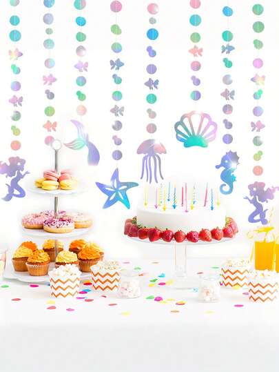 6pcs Mermaid Flower Wreath, Rainbow Color Mermaid Floral Wreath With Jellyfish, Seashells, Stars - Suitable For Mermaid Theme Birthday Party, Rainbow Theme Bachelorette Party, Ocean Theme Party Decor, Made Of Glitter Cardboard, 1/6pcs