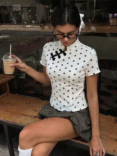 Aloruh Apricot New Chinese Style Button-Up Mandarin Collar Short Sleeve Waist Cinching Blouse, Spring/Summer New Design For Women,Fitted Top,Street Wear,Fitted Shirt,Poka Dots,Gyaru,Holiday,Babydoll Top,Going Out,Casual,Cute,Summer Top