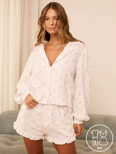 Aralina Croissant Pastry Print Long Sleeve Top And Ruffle Shorts Set - Blue and White - View 1