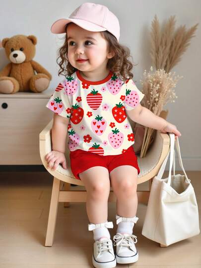 Baby Girl Casual Sweet Summer Polka Dot Strawberry Floral Print, Vacation Style, Retro American, Short Sleeve T-Shirt And Shorts 2-Piece Set, Suitable For Summer