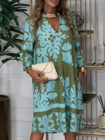Bohemian Style Vacation Skirt: Green Base With Blue Floral Print, V-Neck A-Line Silhouette, Spring/Summer Women's Dress - Multicolor - View 1