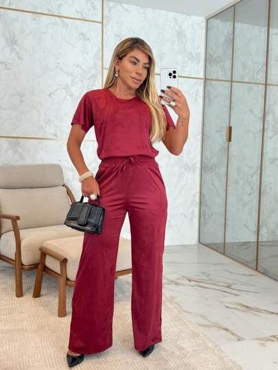 Comfortable Women's Set - Wide Leg Pants and Short Sleeve Blouse