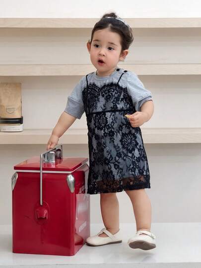 DAZY Baby Girls Korean Style Lace Trim Casual 2 In 1 Dress - Grey - View 1