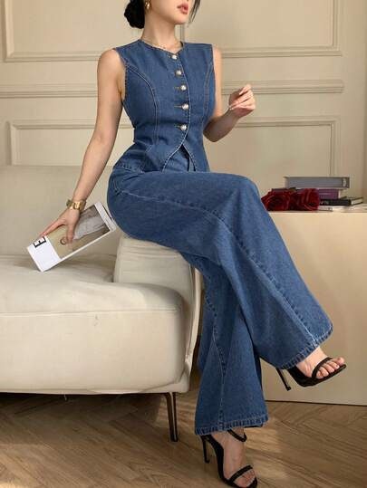 DAZY Women's Round Neck Single-Breasted Top And Flared Pants Casual Denim Suit For Daily Wear - Medium Wash - View 1