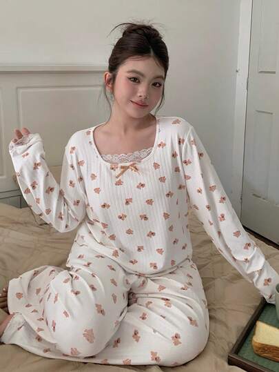 Dazy Plus Fashionable & Cute Cartoon Bear Floral Print Patchwork Collar Fitted Top & Loose Straight Pants Pajama Set, Spring/Autumn - White - View 1