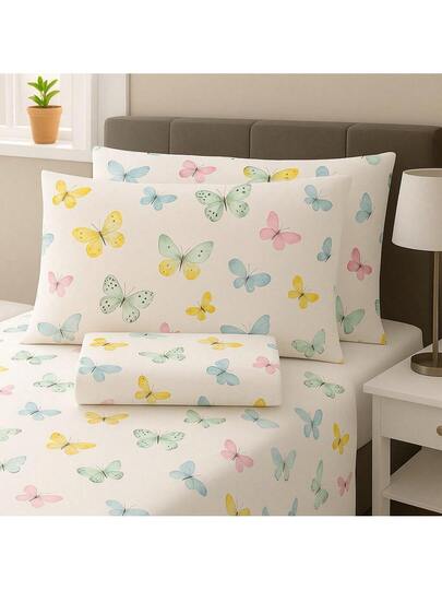 Double Sheet Set With Elastic, 3 Pieces, 100% Cotton, Pillowcase With Stick Stitch Detail, Printed Bed Linens