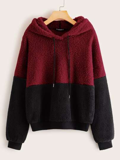 SHEIN Drawstring Detail Colorblock Teddy Hoodie - Multicolor - View 1