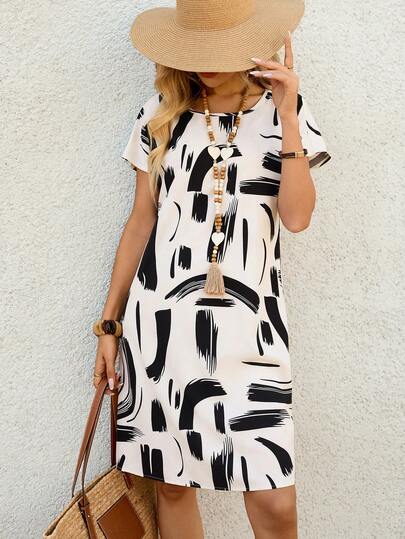 EMERY ROSE Women's Brush Print Round Neck Short Sleeve Casual Mini Dress Casual Dresses For Women Boho  Vacation Dresses  Vacation Outfits For Women Holiday Outfits - Multicolor - View 1