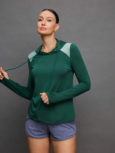 Eassivo Eassivo Color Block Hooded Pullover Casual Long Sleeve Sweatshirt - Dark Green - View 1