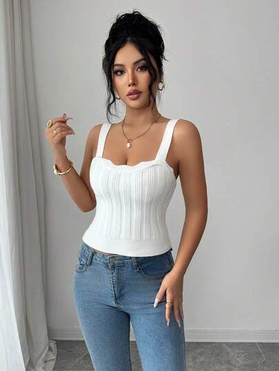 Elenzga Fashionable Frill Trim Women Knit Camisole Top - White - View 1