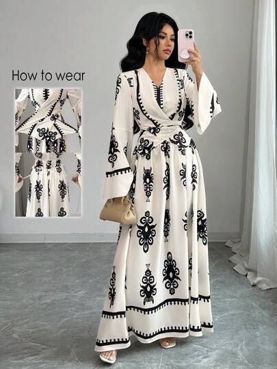 Elenzga Women's Elegant V-Neck Flare Sleeve Waist Wrap Design A-Line Maxi Dress, Floral Retro Print, Spring - Multicolor - View 1