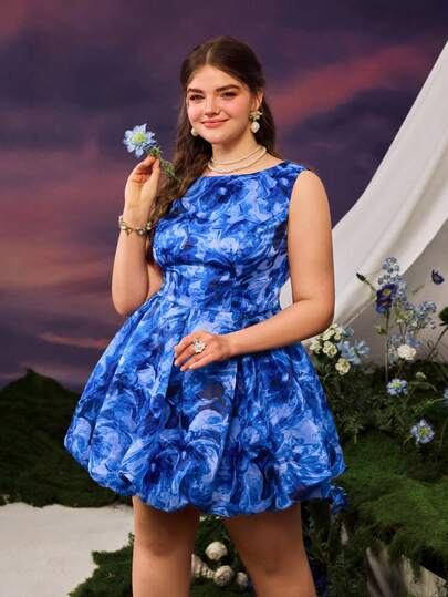 Faeriesty Elegant Floral Print Sleeveless Party Dress - Blue - View 1