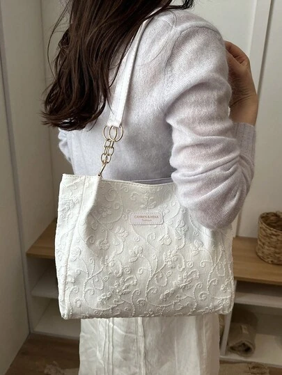 Fashionable Striped Handbag - Women's Large Capacity Shoulder Bag - Zipper Tote Bag For Daily Use - Metal Chain Tote Bag, Waterproof Nylon Material With Butterfly Pattern, Back To School, Small Floral Pattern