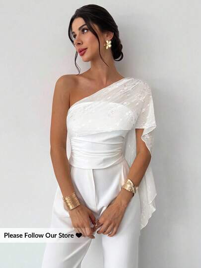 Firerie Women's Elegant Casual Vacation Daily Fashion Versatile White Asymmetric Neck Mesh Patchwork Asymmetrical Tie Fitted Blouse, Summer - White - View 1