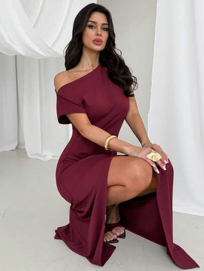 Firerie Women's Elegant Romantic Date Party Tight Dress, Wine Red Asymmetric Sleeve Ruched Twist Hem Slit Bodycon Dress, Wedding Guest Dress, Valentine's Day - Burgundy - View 1