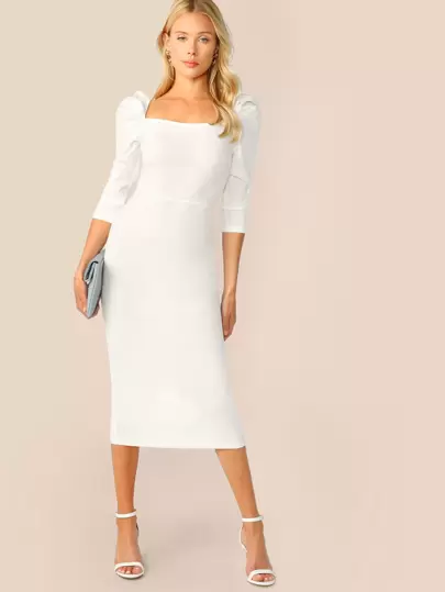 SHEIN Gigot Sleeve Split Back Pencil Dress - White - View 1