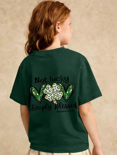 Girls' Casual Colorful Letter Print St. Patrick's Day Design Round Neck Short Sleeve Pullover T-Shirt, Spring/Summer New Arrival - Green - View 1