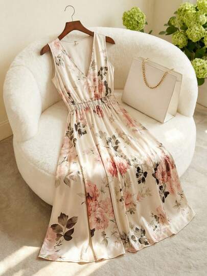 GlowEve CURVE Plus Size Elegant & Fashionable V-Neck Floral Print Elastic Waist A-Line Sleeveless Dress, Suitable For Spring & Summer - Apricot - View 1