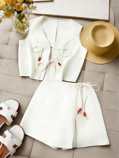 GlowEve Women's 2026 Spring/Summer Beaded Strap Sleeveless Vest And Shorts 2 Pieces Set - Apricot - View 1