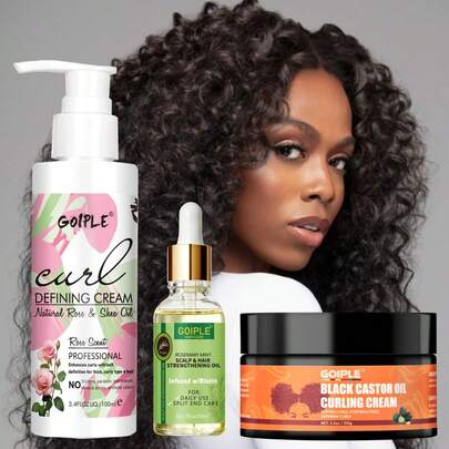 Goiple Black Castor Oil Curling Cream, Curl Defining Cream And Rosemary Oil 3 Pieces Set, Curl Cream, 3.5oz/100g, Curl Defining, Frizz Control, Lightweight, No Residue, Enhances Natural Bounce, Smooth Finish, Softens, Strengthens, Rosemary Hair Care Oil Deeply Nourishes, Non-Greasy, Detangles, Boosts Manageability, Leave-In Conditioner Suitable For Kinky Coily Hair, Women All Curl Types