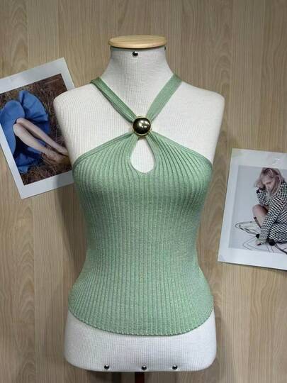 Halter Mesh Top With Metallic Detail