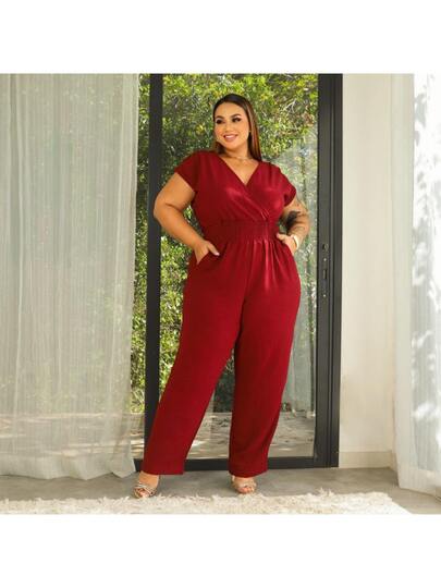 Plus Size Jumpsuit for Everyday - Women's Elastex Strap V-Neck Wrap Jumpsuit
