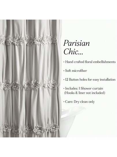 Pretty, elegant, and unique. With details such as ruching and crafted flowers this is a curtain that can change the whole look of your bathroom without overwhelming it. Incredible value is another way to describe this product.