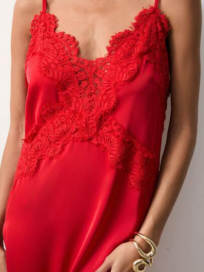 Maija Women's Fashion Sexy Lace Patchwork Spaghetti Strap Dress Women's Red Dress Red Wedding Guest Dress Red Lace Top - Red - View 1