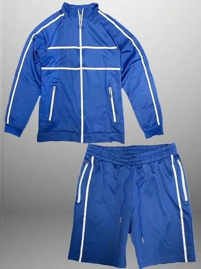 Mens and Unisex Striped Tape Light Weight Track SET NOT REFLECTIVE Matching Zip Up Warm Up Jacket and Shorts Standard Pocket Bottoms with Standard Pockets and Single Back Pocket Good Mid Weight Fabric Cotton Polyester 95% Polyester 5% Spandex Order True to Size