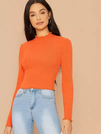 SHEIN Neon Orange Lettuce Trim Rib-knit Tee - Orange - View 1