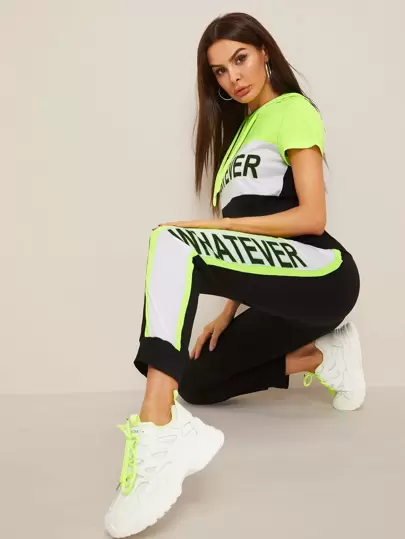 Neon Panel Top & Letter Tape Side Sweatpants - Multicolor - View 1