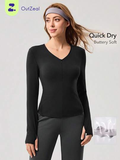 OutZeal Women Sports Tee Black Yoga Gym Wear Quick Drying Long Sleeve V Neck Slim Tops - Black - View 1