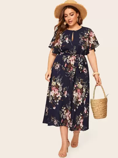 Plus Keyhole Front Floral Print Belted Dress - Multicolor - View 1