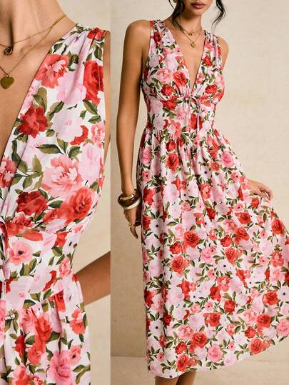 Poéselle Women's Summer Vacation Floral Print Deep V-Neck Tie Front Sleeveless Waist Cinched Dress - Red - View 1