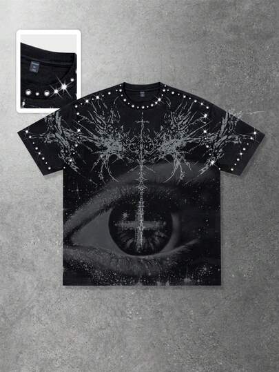 ROMWE MEN 2026 Spring, Autumn & Summer Men's Casual Rhinestone Embellished Round Neck Printed Short Sleeve T-Shirt, Punk Street Y2K Style Summer Top - Black - View 1