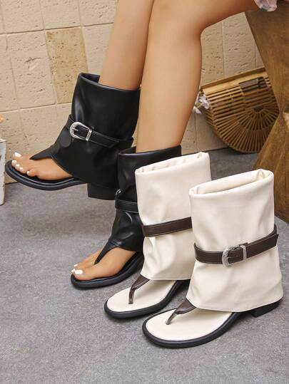 Retro Hong Kong Style Summer New Fashion Casual Comfortable Buckle Clip Toe Folding Mid-Calf Sandals, Stylish Street Chic Slim Black Sandals - Black - View 1
